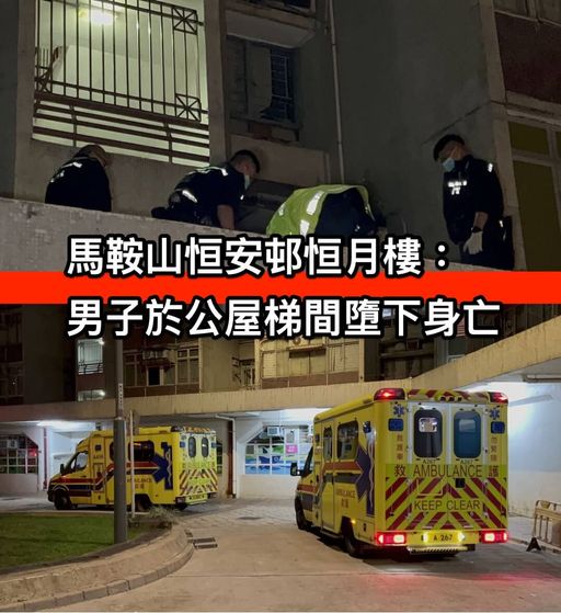 [image: 1703504564342-%E9%A6%AC%E9%9E%8D%E5%B1%B1%E6%81%92%E5%AE%89%E9%82%A8%E6%81%92%E6%9C%88%E6%A8%93%E5%87%B6%E5%AE%85.jpg] 12月25日凌晨3時許,63歲姓莊男子離開馬鞍山恒安邨恒月樓住所後失去聯絡,家人懷疑他自尋短見,遂報警求助。 [image: 1703504547315-%E9%A6%AC%E9%9E%8D%E5%B1%B1%E6%81%92%E5%AE%89%E9%82%A8%E6%81%92%E6%9C%88%E6%A8%93%E5%87%B6%E5%AE%852.jpg] 警方及救援人員到場搜索,發現事主倒臥在大廈簷篷,當場證實死亡。 [image: 1703504551406-%E9%A6%AC%E9%9E%8D%E5%B1%B1%E6%81%92%E5%AE%89%E9%82%A8%E6%81%92%E6%9C%88%E6%A8%93%E5%87%B6%E5%AE%851.jpg] 警方經調查,相信事主從大廈梯間墮下,在場沒有檢獲遺書,死因有待驗屍確定。據悉,事主有身體病紀錄。 [image: 1703504555119-%E9%A6%AC%E9%9E%8D%E5%B1%B1%E6%81%92%E5%AE%89%E9%82%A8%E6%81%92%E6%9C%88%E6%A8%93%E5%87%B6%E5%AE%853.jpg]