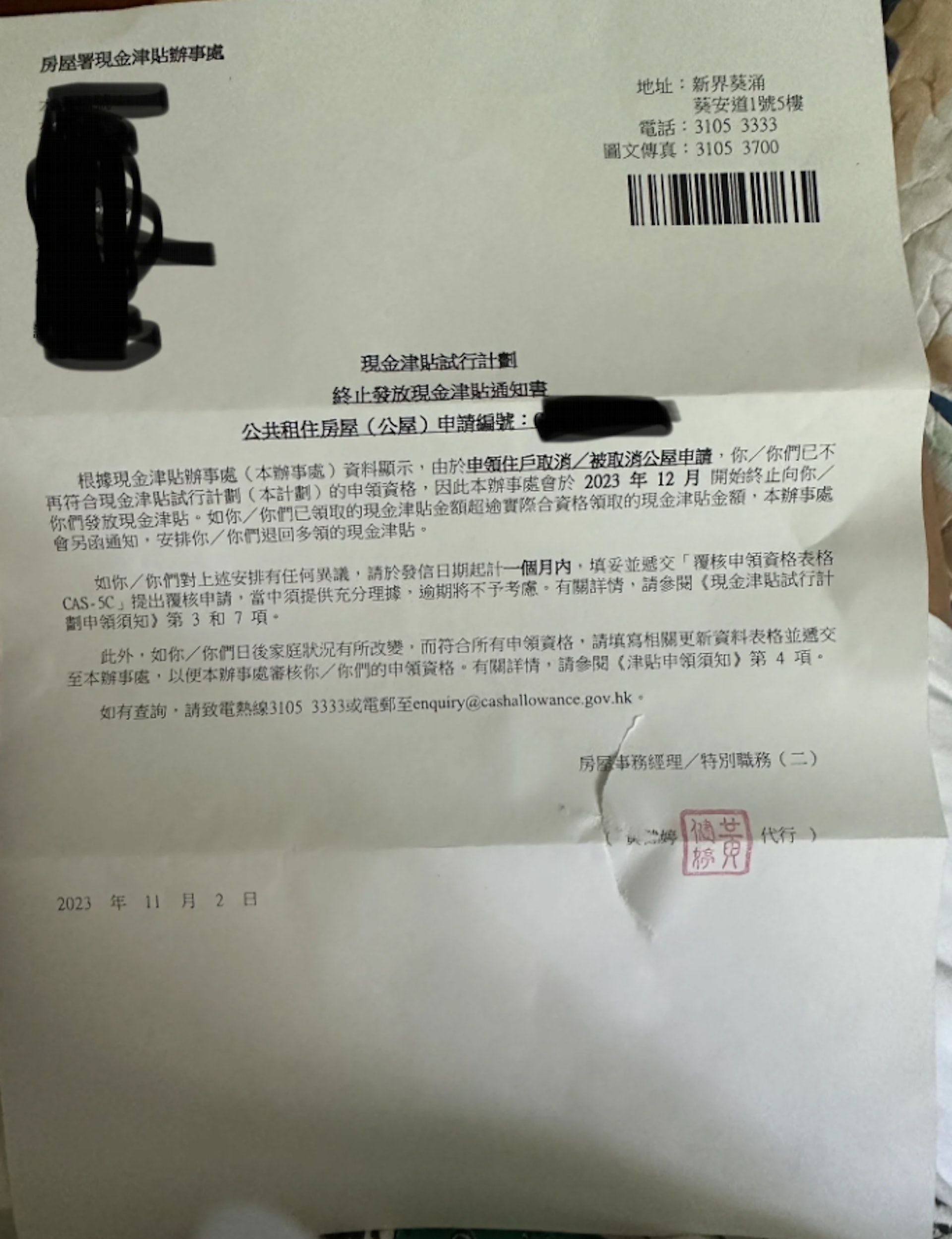 樓主稱他收到同樣的信件,疑問是否收到該信等同被取消公屋申請,「我剛剛收到這封信一模一樣的,那公屋資格也取消了嗎?」。他指9月見房署主任時,入息資產超出限額,收到的信件在11月2日發出,但內容其實和轉載帖文中的信件不同,樓主的信件明確提到「由於申領住戶取消/被取消公屋申請」,故已不符合現金津貼試行計劃的申領資格。