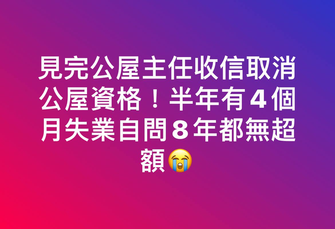 老公畀佢無良公司即炒,兩個月冇工番已經好傷,依家重要收到公屋取消信同現金津貼取消信。自問由申請公屋輪候到依家都有成7,8年,咁多年嚟都未超過入息。唉好想喊😭